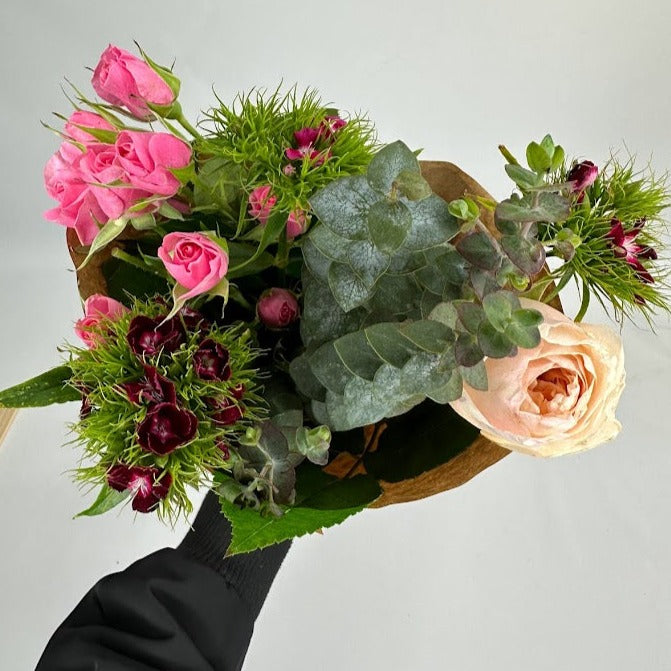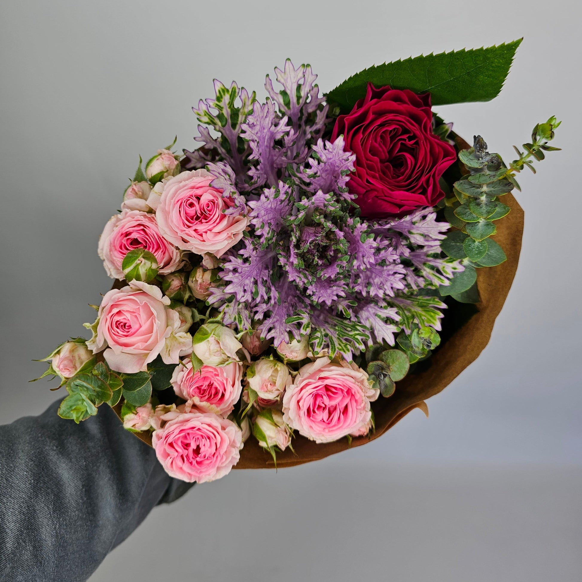 The Kogarana bouquet is our petite beauty! A mix of greenery and two stems of roses. This compact bouquet makes it a lovely gift for any occasion.